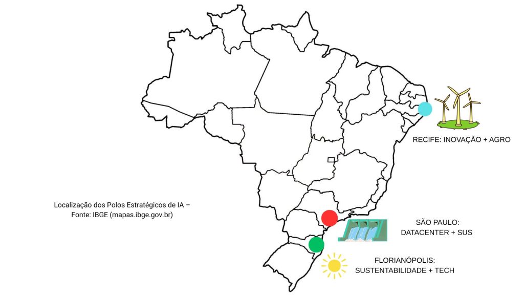 São Paulo destaca-se como o principal polo devido à sua posição de liderança econômica e tecnológica no país. O estado concentra 31% do PIB brasileiro, equivalente a R$ 2,8 trilhões em 2024 [Fonte: IBGE, Contas Regionais 2024], e abriga 40% dos datacenters da América Latina, representando 54% da capacidade de computação em nuvem da região [Fonte: Santander, “Brasil é atrativo para data centers”, Teletime, 17/07/2024]. A infraestrutura de conectividade é reforçada por cabos submarinos como o EllaLink, que liga o Brasil à Europa [Fonte: TeleGeography, Submarine Cable Map 2024]. Além disso, o supercomputador Iara, com 125 petaflops, já opera em São Paulo [Fonte: SiDi, Comunicado Oficial 2024], enquanto o Sistema Único de Saúde (SUS) atende 50 milhões de habitantes no estado, gerando um volume significativo de dados para aplicações de IA em saúde [Fonte: Datasus, Relatório 2024]. As universidades de São Paulo (USP) e Campinas (Unicamp), ambas no top 200 mundial, formam uma força de trabalho qualificada, com 737 usuários ativos no Centro Nacional de Processamento de Alto Desempenho (Cenapad-SP) [Fonte: Cenapad-SP, Relatório 2024]. Nenhum outro centro urbano brasileiro combina essa densidade de recursos econômicos, tecnológicos e humanos, tornando São Paulo o ponto de partida incontestável para um projeto-piloto de IA. Iniciar aqui permite testar a viabilidade do plano em um ambiente de alta visibilidade e pressão por resultados.