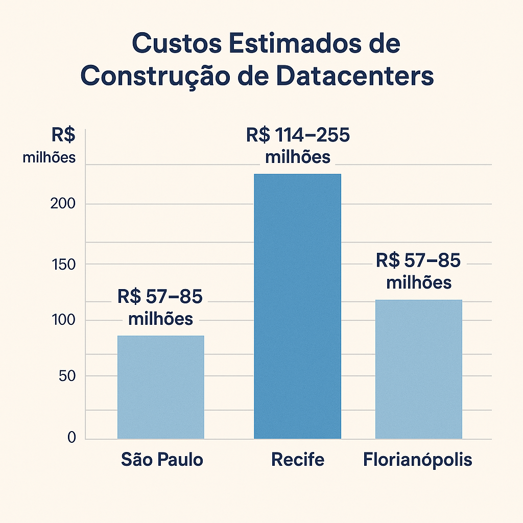 Custo: R$ 57-85 milhões para construção [Fonte: Dgtl Infra, 2024]. Operação anual: R$ 10-15 milhões [Fonte: Web ID 5, 2024].